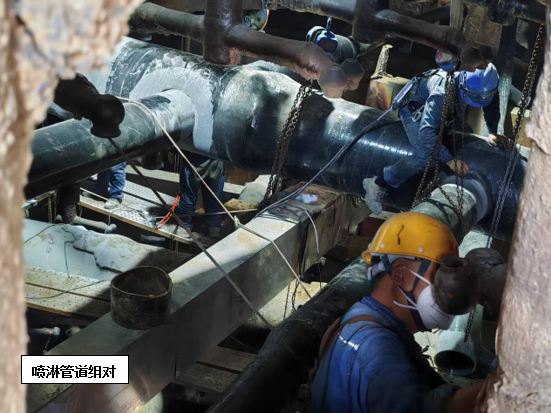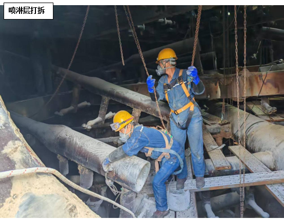 維修方案確定后,攀藍鼎立即開始著手噴淋管道采購預制工作,考慮到目前燒結(jié)產(chǎn)能不飽和,系統(tǒng)多處停機的因素,決定預制管道到廠后由檢修進行拆除及更換,只保留技術性要求較高的玻鋼粘接由專業(yè)施工人員來完成。7月24日,在材料到廠后,檢修立即開始在塔內(nèi)布置安全措施,并進行噴淋層打拆工作,打拆過程中檢修對切下的三通支管進行仔細甄別,磨損嚴重的進行報廢處理,還具備使用價值的作為備件歸置,以確保物盡其用。打拆完畢后,檢修隨即進行管道吊裝及內(nèi)部組裝配管工作,配管完成后防腐單位開始進場作業(yè),在此過程中檢修全程安排人員進行組對及工程質(zhì)量監(jiān)督工作,并及時撤場收尾。